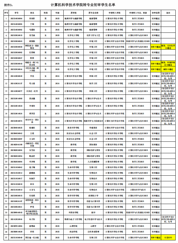 根据《计算机科学技术学院本科生转专业实施方案》,经学生个人申请,学院审核,共有33名申请转专业学生通过初审,符合报名条件。现将结果进行公示: