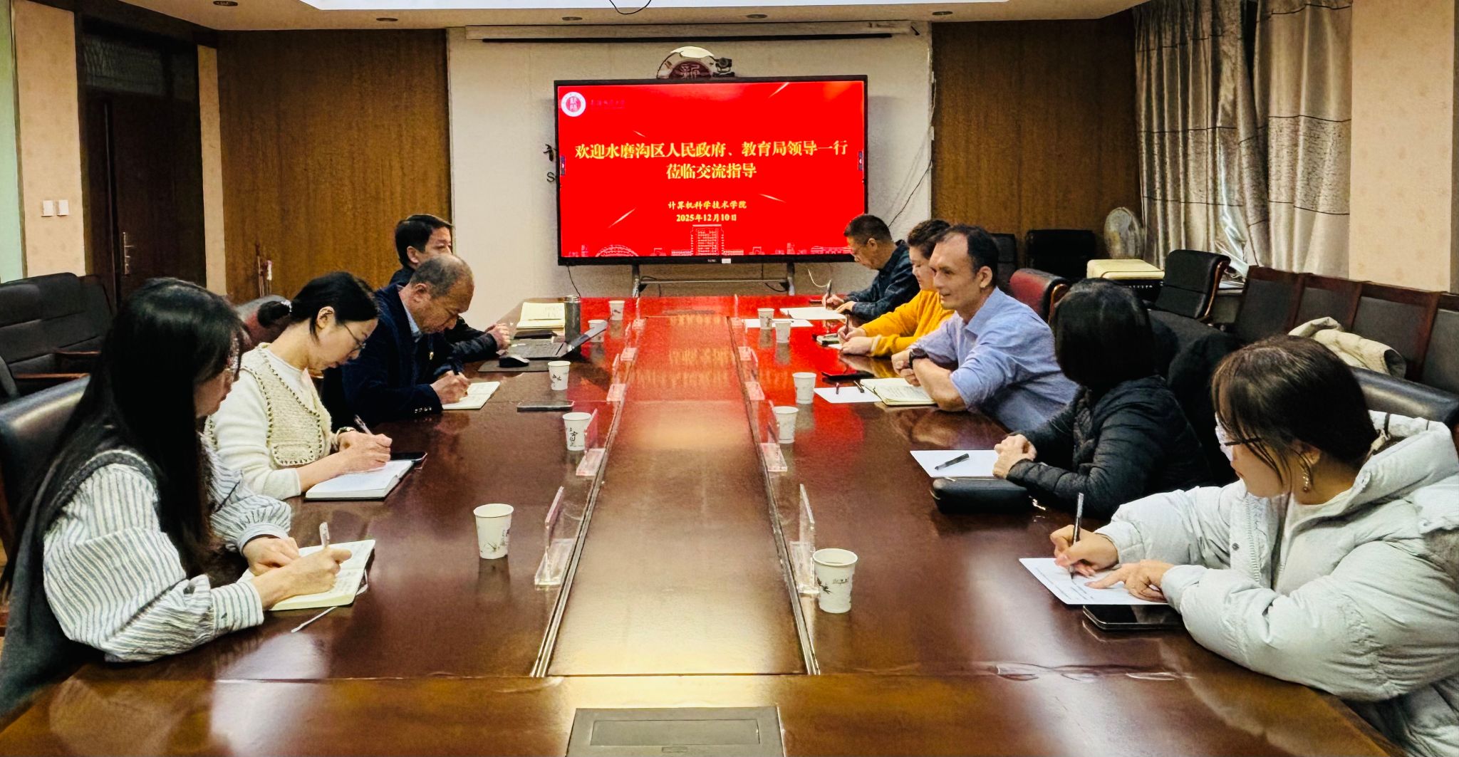 2025 年 12 月 10 日,乌鲁木齐市水磨沟区人民政府副区长杨鹏、区教育局工会主席李潇一行莅临新疆师范大学计算机科学技术学院开展调研交流。学院党委书记张海军、党委副书记、院长齐向伟热忱接待,双方相关部门负责人参加座谈,围绕教育数字化转型及多领域协同发展展开深度对话。